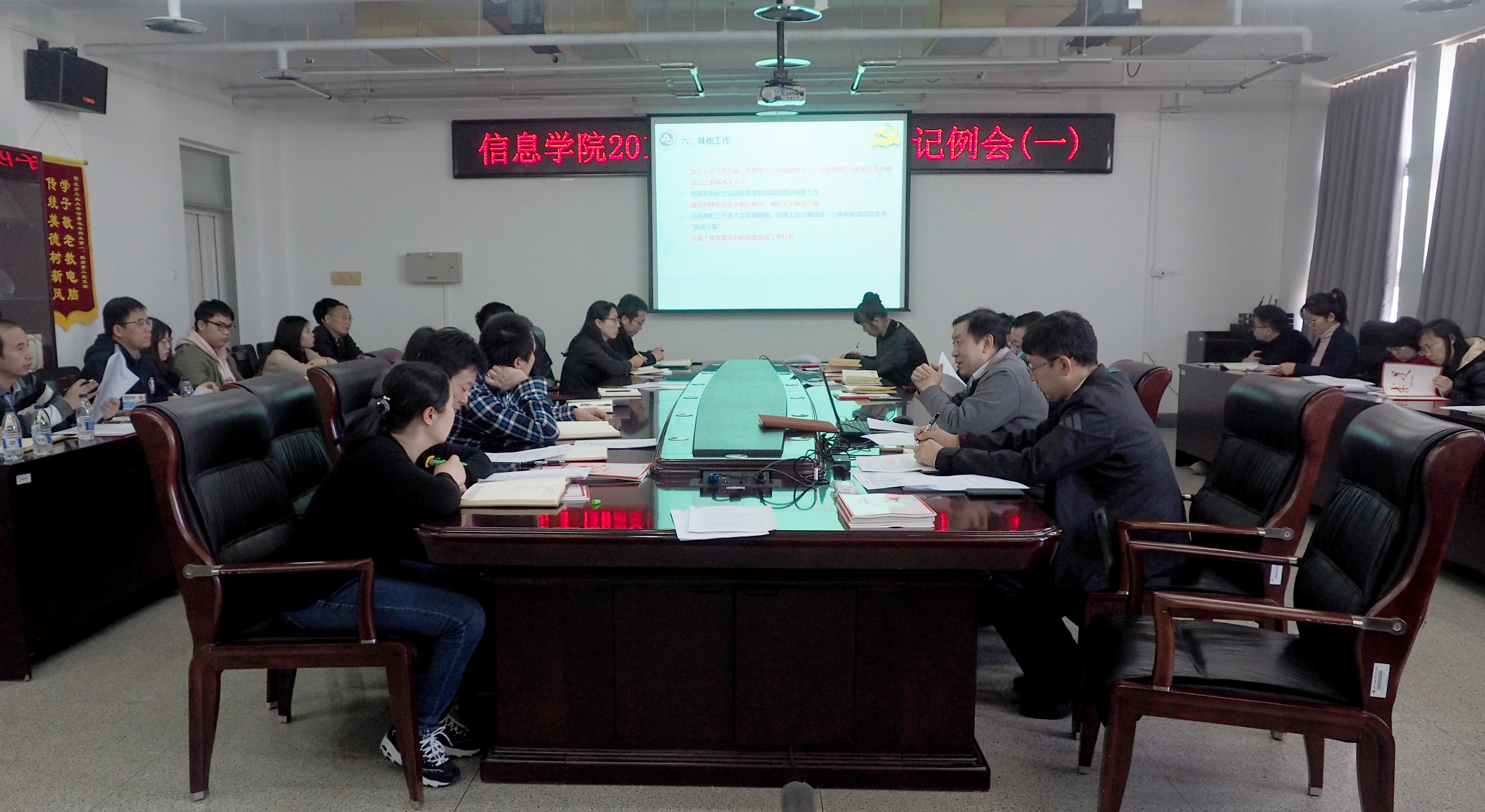 首先,党委书记刘文楷传达了学校二级单位党委书记例会精神,并分别从加强思想政治建设,坚定理想信念;以提升组织力建设为根本任务,充分发挥基层党组织的战斗堡垒作用;认真履行党委主体责任,不断巩固全面从严治党的各项工作成果;党风廉政建设工作;意识形态领域工作;其他工作几个方面阐释了学院党委2019年的工作要点。同时,他指出了学院重组之后,学院党委工作、各党支部工作面临的机遇与挑战。