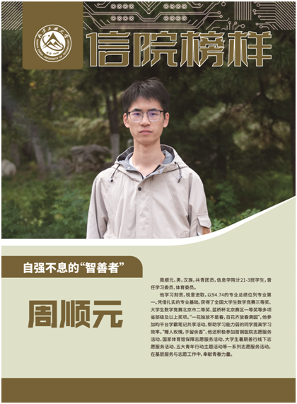周顺元,男,汉族,共青团员,米乐mile体育官网计21-3班学生,曾任学习委员、体育委员。