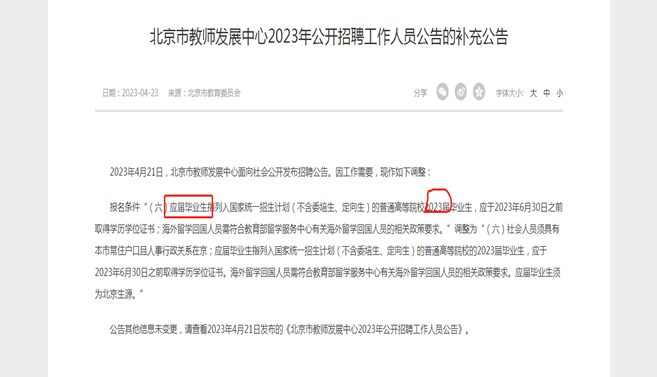 最后,今年开始很多京内外事业单位和政府机关单位招聘应届生的同时,明确界定了23年毕业时限的要求,这也意味着如果错过毕业当年的求职机会,下一年也很难再如疫情期间以应届生身份在择业期内继续考取应届生的招聘岗位。下图为部分事业单位21年招聘要求和23年招聘要求政策对比。