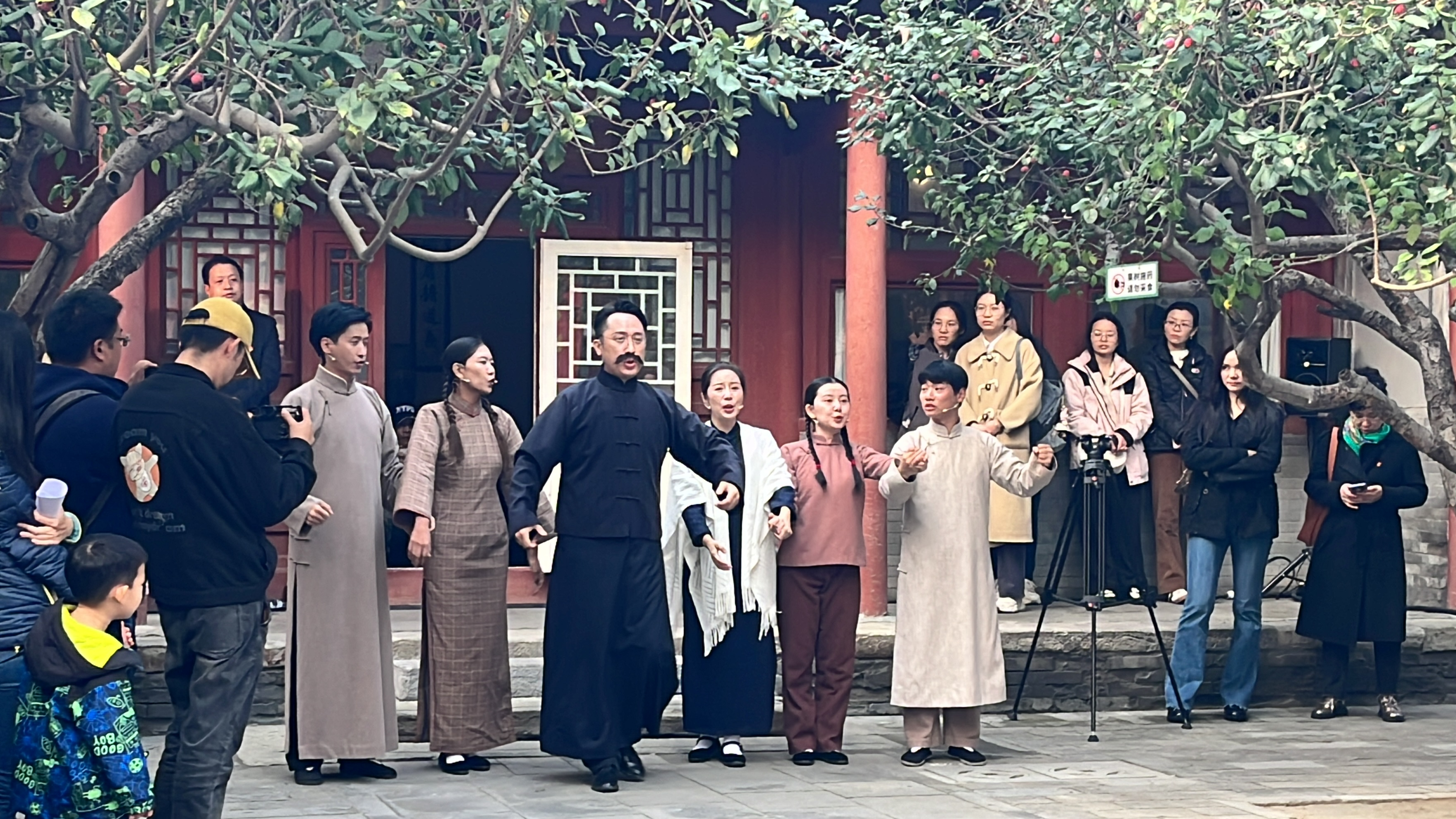 在合院中间现场沉浸式观看了话剧《守常先生》,身着民国时期服装的演员扮演李大钊、家人、同事和学生,通过对话式话剧唱腔,用饱满的情绪演绎着李大钊一个个鲜为人知的生活片段,让参观者身临其境地感受到李大钊与家人之间的生活温情、对子女的谆谆教诲、对反动势力的威武不屈、对中国共产党建立的坚定信念。